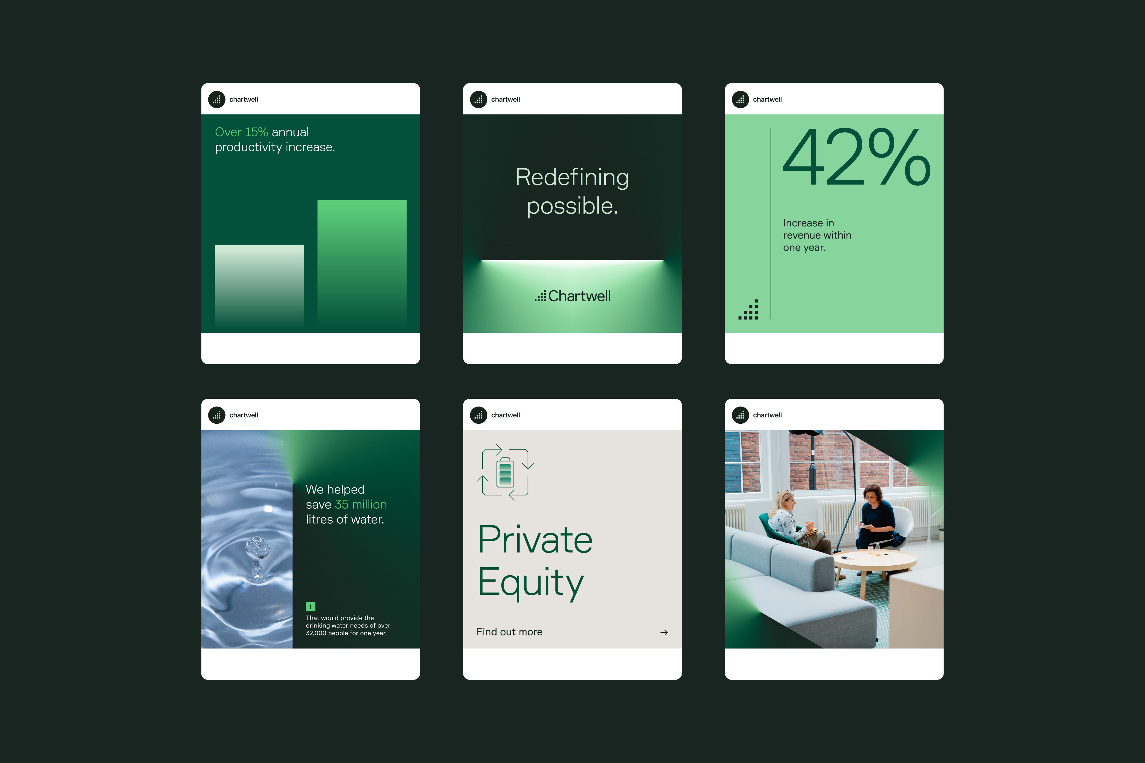 I led the wider rollout of the brand across every touchpoint, from business cards and stationery to banners and social templates. This included designing a bespoke icon set and directing the motion design of The Defining Edge, ensuring that animations also reflected the brand’s personality. The result was a cohesive and powerful brand experience that worked seamlessly across mediums, helping Chartwell stand out and confidently compete with larger players.