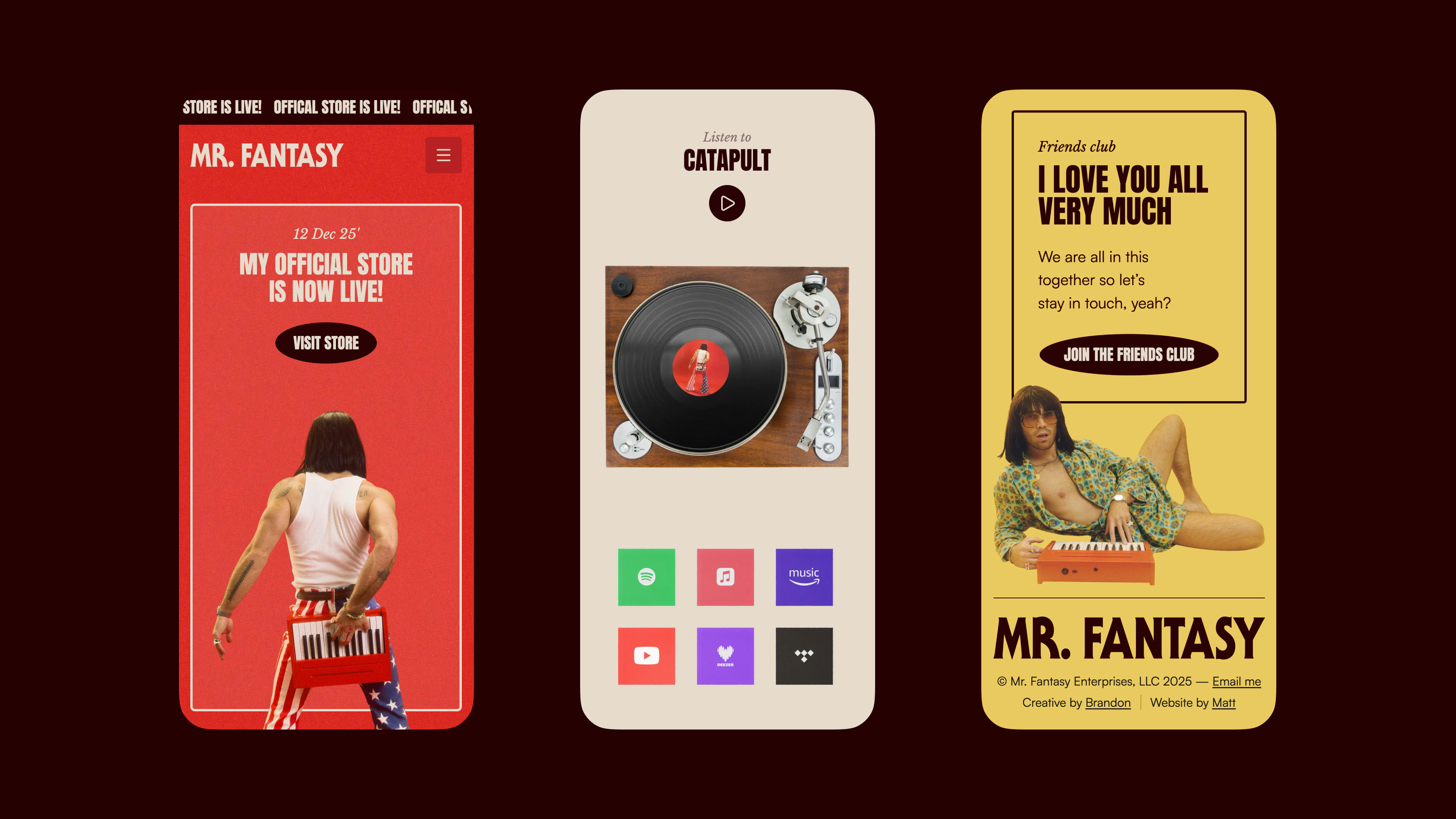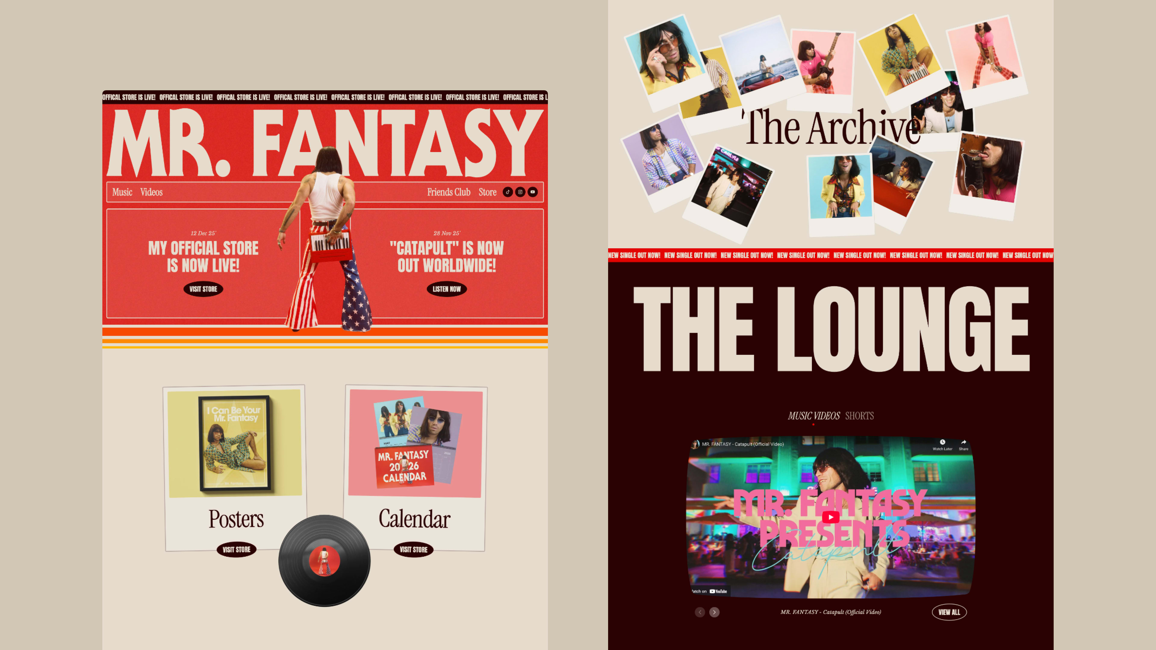 The project set out to build a distinctive digital hub that mirrors Mr. Fantasy's eccentric persona, covering both the design and custom development of the marketing site and extending the new visual language into a customised Shopify theme. Drawing inspiration from 70s posters and advertising, the site leans on bold typography, rich colour and playful layouts, with characterful animations and micro-interactions designed to deepen fan engagement. The result is an immersive, fan-focused world that captures the energy of his viral moments and gives Mr. Fantasy a new digital stage to grow his music. The project was led by the creative direction of Brandon Staniford, who created key visual assets for the site.